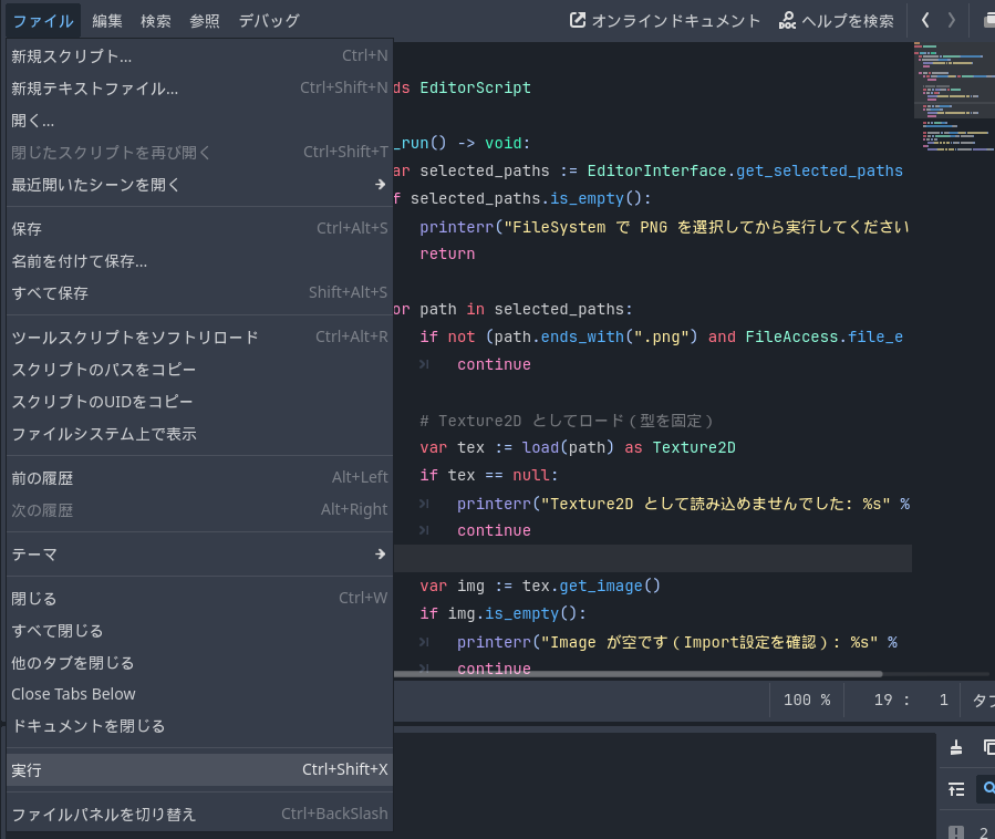2.エディタ上部のファイル>実行
